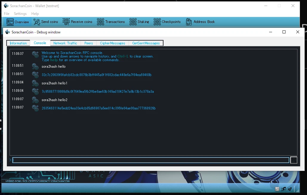 Debugウィンドウから「sora2hash」コマンドを使用することで、ハッシュ値を確認できます。 また、バージョン3.102.15以降では、この耐量子ハッシュ関数SORA2の本格的なシステム導入を開始しています。